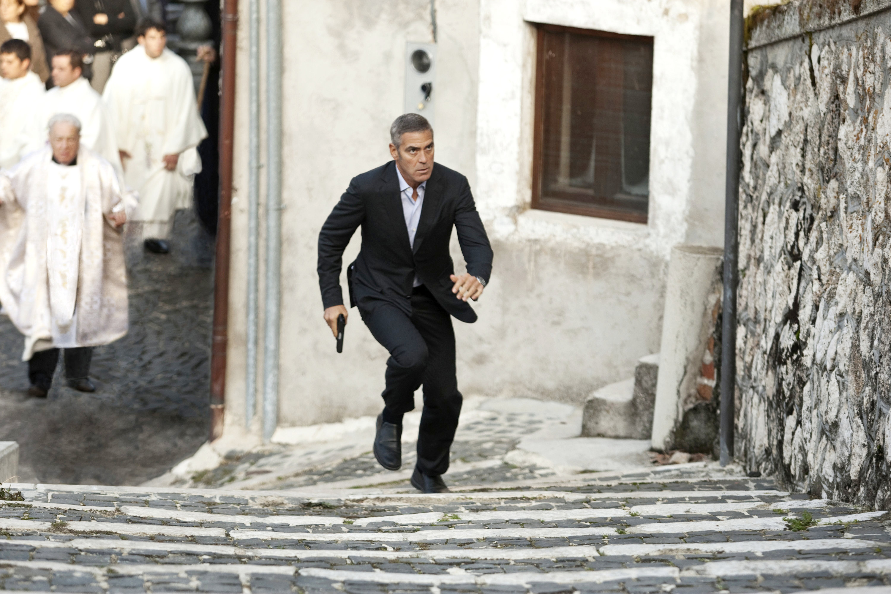 Clooney plays Edward, a gunsmith who hides out in a quiet Italian village while he completes a job. A man of very few words, Edward is a dedicated craftsman, and he efficiently refines a rifle with care and precision, initially without remorse for the job for which it will be used. He has been hired by Mathilde (Thekla Reuten), an assassin who looks different each time she appears, presumably an asset in a job like hers. She is impressed by the quality of his work but takes the measure of him: after paying him off she suggests he should use the money to buy a retirement clock.