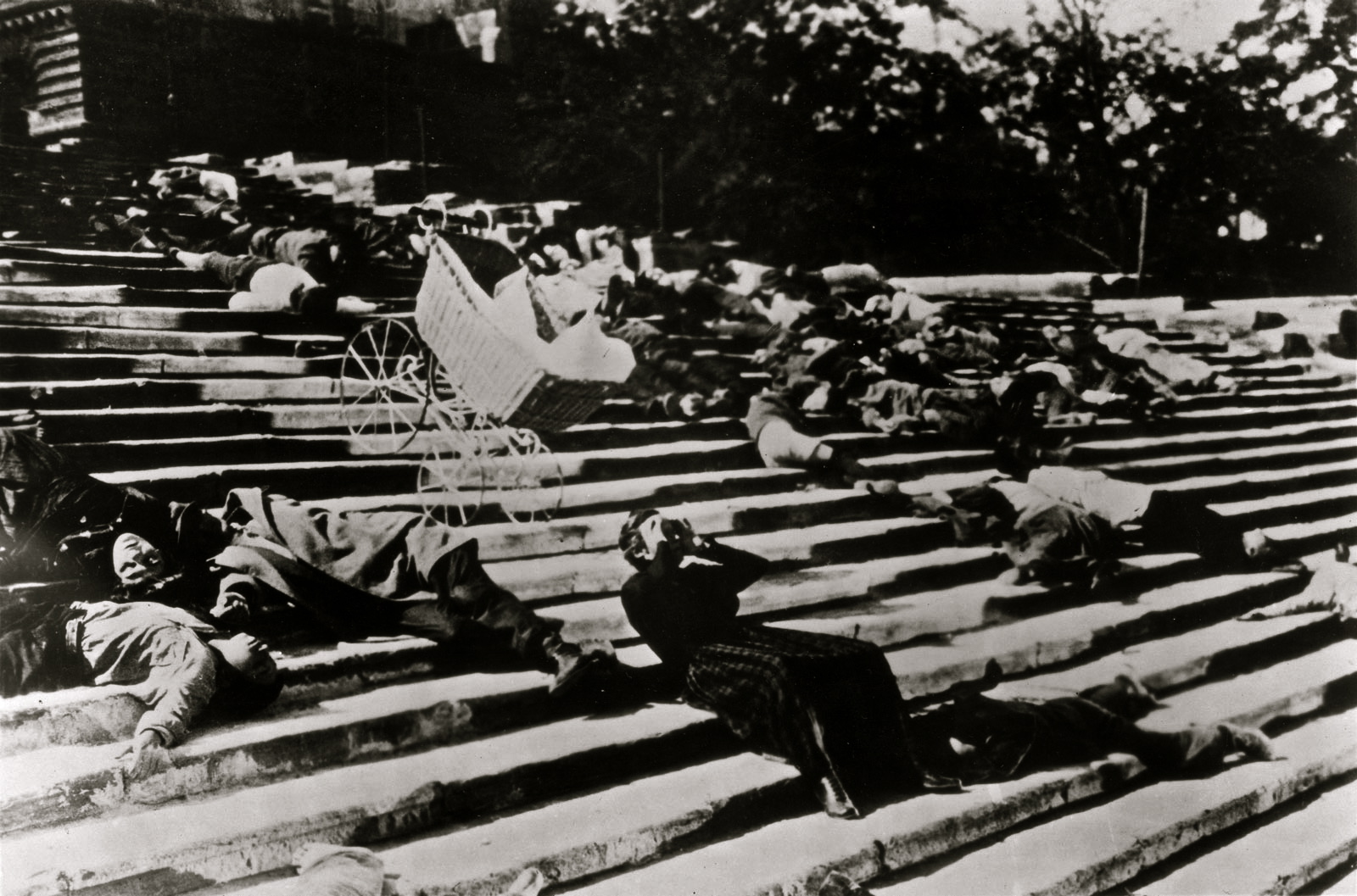 The Potemkin is a weapon for freedom, united by its passionate crew, bound as a fighting collective. It is this united characterisation of protest that makes Battleship Potemkin so powerful. Revolution is never portrayed in just one character, but as a brick wall of men standing together, arms locked, ready to fight. Not only is victory accomplished as a group in Battleship Potemkin, so too is death and loss. During the famous “Odessa steps” sequence, a massacre of innocent people brings the film to a nightmarish clash of violent and disturbing imagery. The people are killed for supporting the revolution in which Potemkin has taken part. Their murderers are a faceless pack of soldiers, who storm in like a steamroller, finding the people of Odessa at the top of the steps, and leaving them dead at the bottom. “The immediate function certainly is to prove the brutality of the Tsar’s soldiers, who appear as an inhuman line of boots, rifles and shadows as they massacre hundreds of civilians.” (Neupert, 2007: 536)
