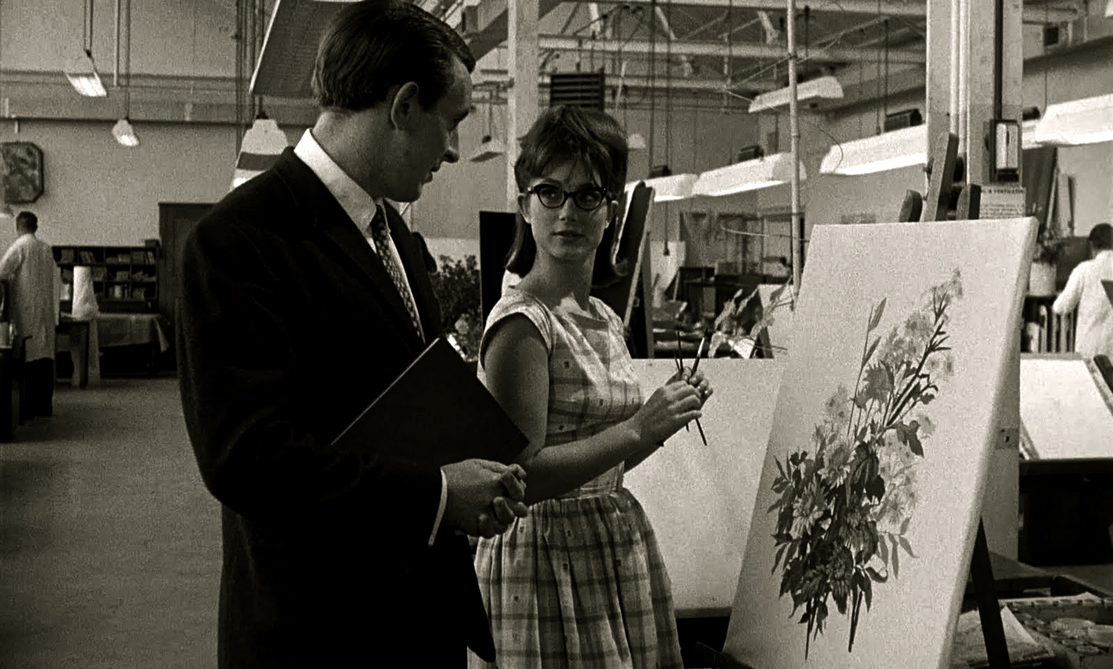 The film’s plot, at first, is somewhat simple. Shirley Anne Field plays a young woman, starting her new job at a London textile and wallpaper company. She quickly catches the eye of Robert Stephens’s character, an older male manager, working within the same building block. The two are unknown by name, but not by nature. We witness the pair grow closer spiritually, while a tense sexual atmosphere slowly grows between them.