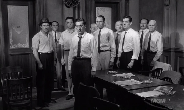 What maintains the tension is that the twelve are locked in the room suffering in the heat, and the fan doesn’t work. The very good script by Reginald Rose has a a couple of moments that are a little weak and theatrical, mostly involving Begley and Cobb, who both give the broadest performances. When Begley goes on a racist tirade, the others turn their backs on him: it`s the stagiest- and for me, the weakest – moment of the film. Cobb`s breakdown at the end is a melodramatic piece of scenery-chewing.