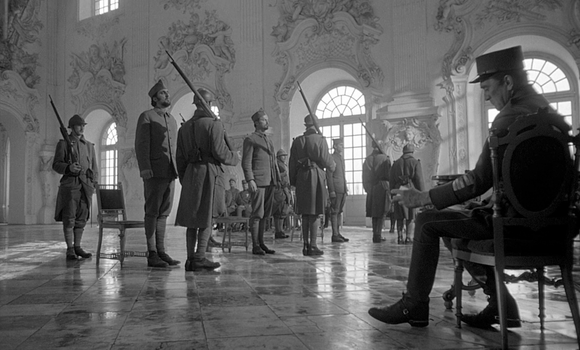 As with much of Kubrick’s work, there is an awful lot of formal composition in the frame, and to further belittle his characters he places them in the cavernous rooms of a chateau. This is a very loud picture: you can’t ignore the sound of footsteps on marble floors, nor can you ignore the obvious contrast between generals calmly discussing brutal acts while sitting on beautiful furniture surrounded by Renaissance art. And I don’t think it’s an accident that the execution of three soldiers is framed in a way that will make you think of Calvary. What redemptive power is there in this crucifixion?